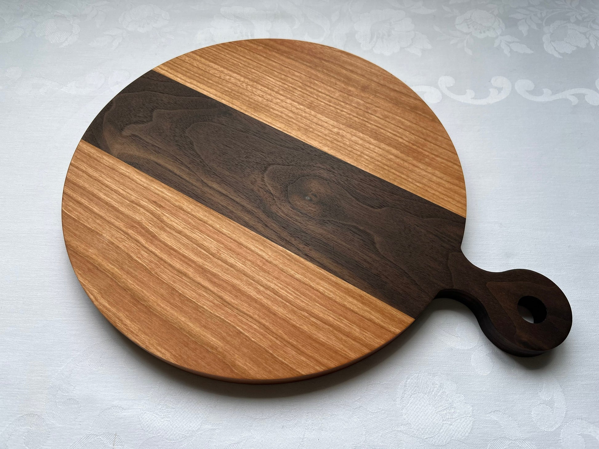 This board is made from cherry and has a beautiful piece of walnut through the middle of it..